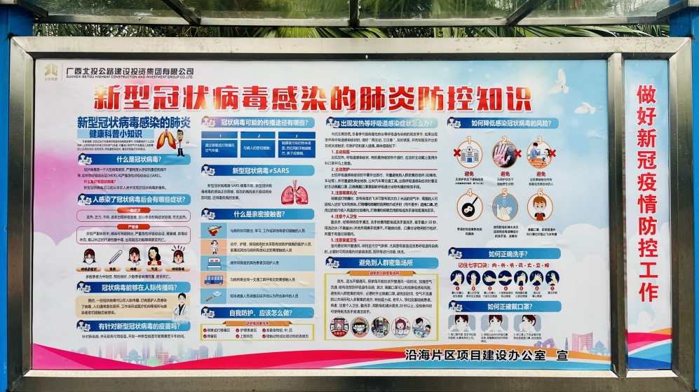 加強防疫知識宣傳引導。北投公路集團沿海片區項目建設辦及時組織宣貫學習黨中央、省市委和集團公司關于疫情防控工作部署要求和文件精神,嚴格貫徹落實相關疫情防控的決策部署和政策措施,積極制作、張貼新冠疫情防控知識讀本和宣傳板報,帶頭宣傳衛生健康防護知識,宣傳防治信息、普及科學知識,進一步提高員工的自我防護意識和能力,保障人身安全。