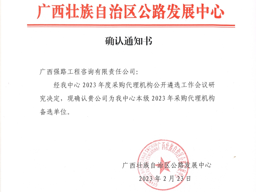 強路公司順利入選廣西壯族自治區公路發展中心2023年度采購代理機構庫