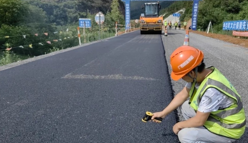 圖為現(xiàn)場管理人員核查瀝青面層溫度