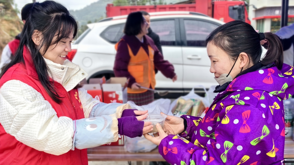 圖為青年志愿者為返鄉群眾送上愛心湯圓